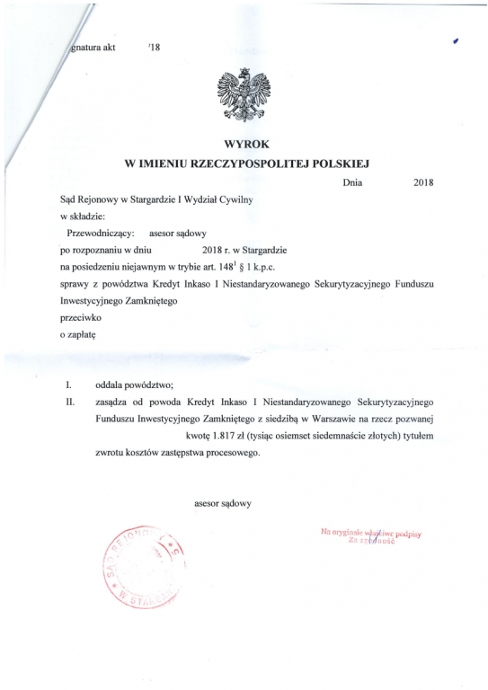 11.10.2018 r. - Kolejna przegrana Kredyt Inkaso I